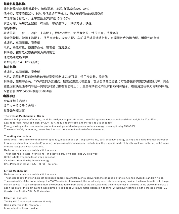 低噪音、免维护(降低检修时间及维护成本低)(因结构简单,故配套件品种少,后期方便采购,同时也降低了库存)。我公司的欧标起重机通过变频器调速,能有效减少用电量20%-30%,降低了使用成本,提高了使用效率。